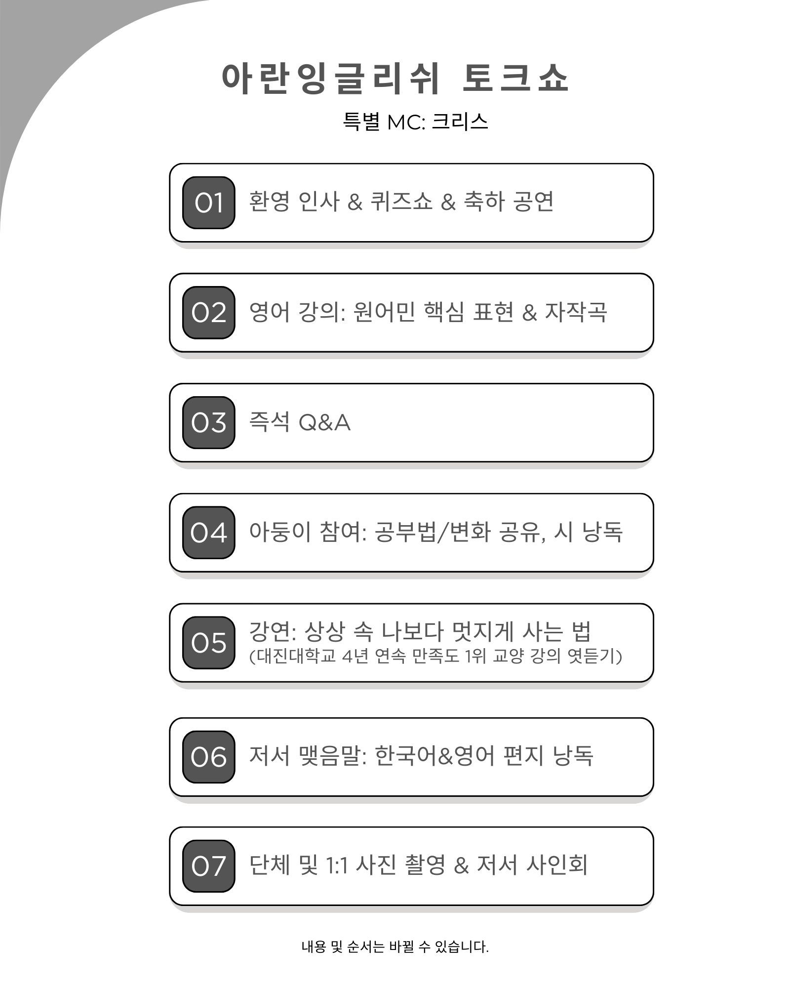 - 원하시는 분들과 1:1 사진 촬영 및 저서 사인은 오후 6시까지 가능하니 시간을 넉넉히 비우고 와주세요.